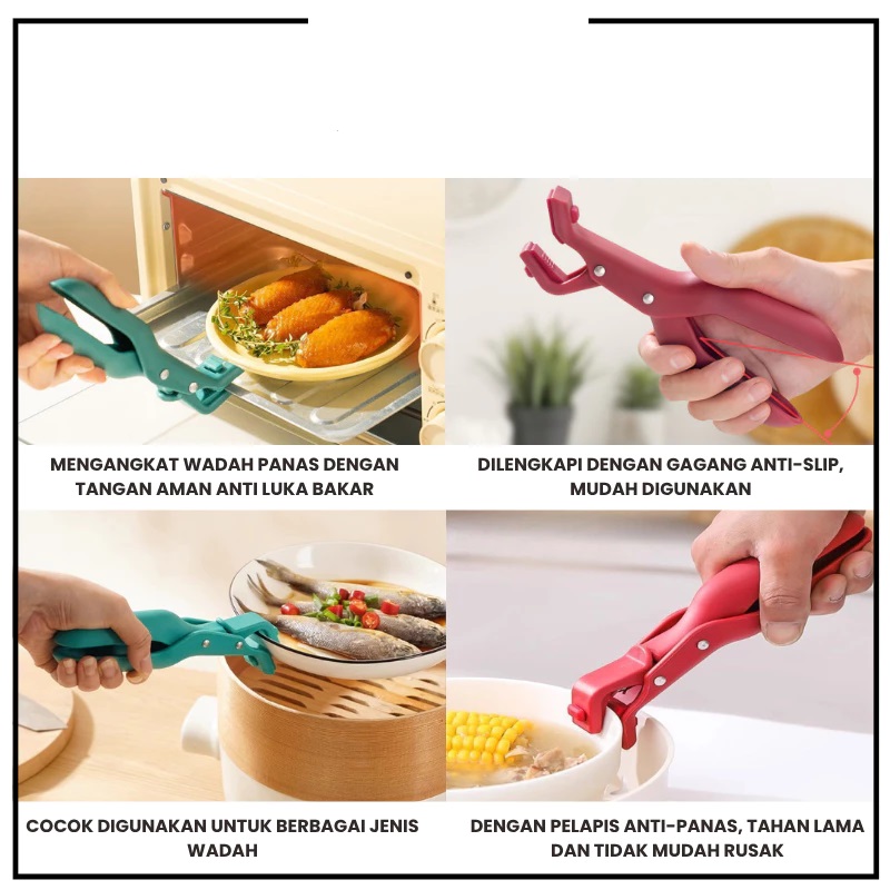 Capitan serbaguna ini tidak hanya berfungsi sebagai penjepit mangkok dan piring, tapi juga efektif untuk mengangkat panci kecil, loyang, atau wadah lain yang panas. Desainnya yang ringkas dan mudah disimpan membuatnya menjadi alat wajib yang praktis di setiap dapur.