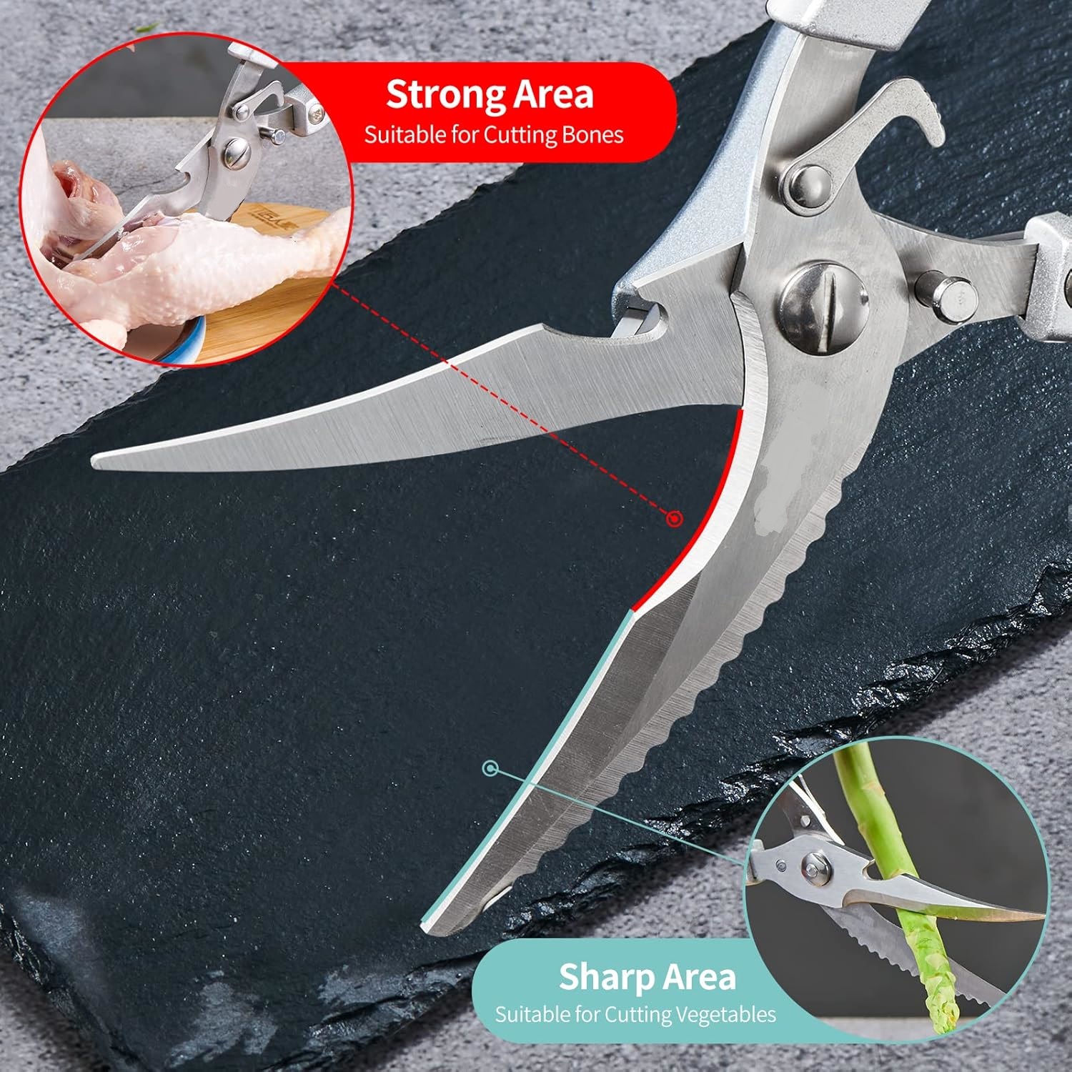 Gunting dapur serbaguna ini terbuat dari baja tahan karat berkualitas tinggi dan gagang aluminium baja tahan karat setebal 3,5 mm lebih tajam, dan tidak melengkung.
